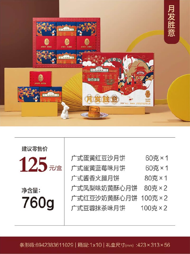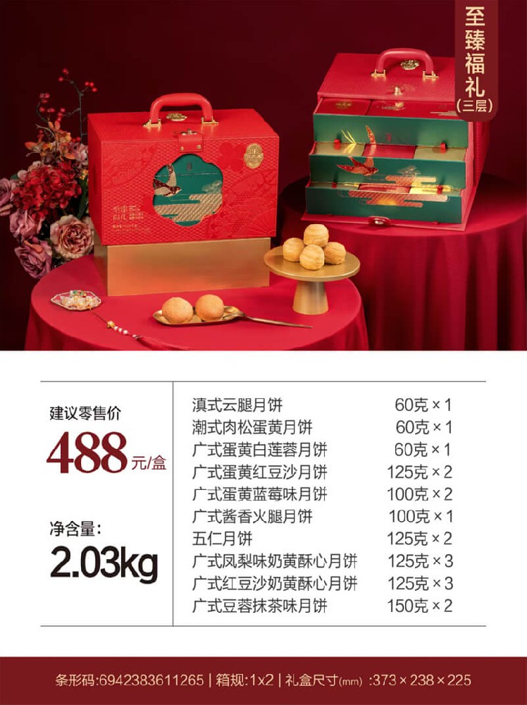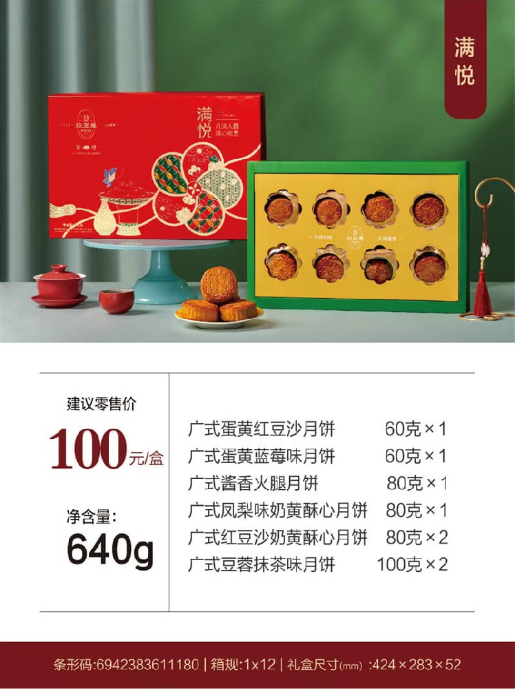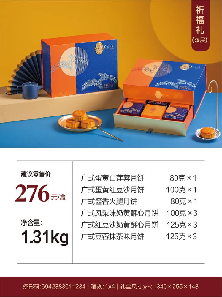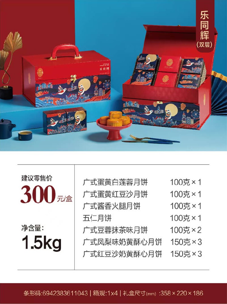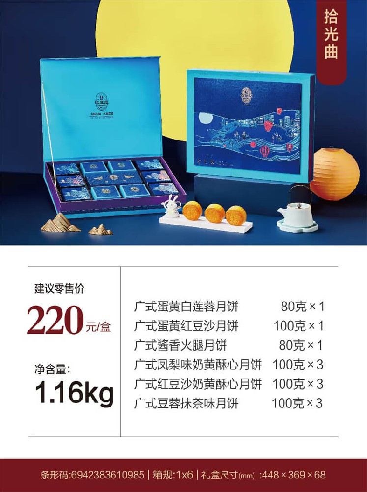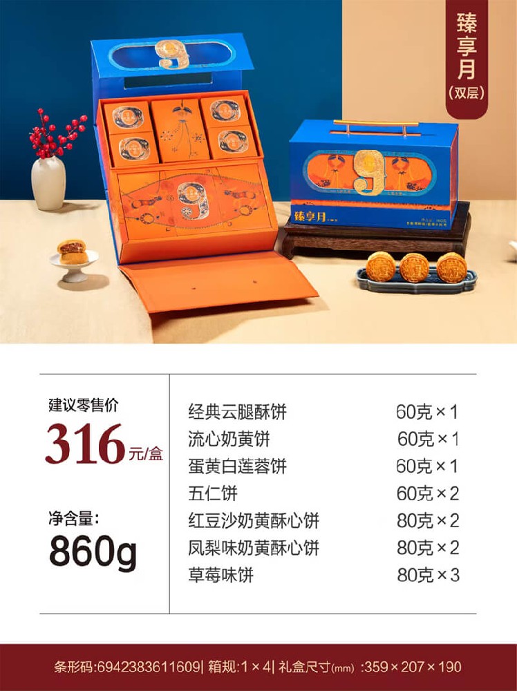 内容物:滇式云腿月饼60克×1潮式肉松蛋黄月饼60克×1黑松露流心奶黄月饼60克×1广式蛋黄白莲蓉月饼100克×1广式蛋黄红豆沙月饼150克×2广式豆蓉椒盐月饼150克×2广式红豆沙···...