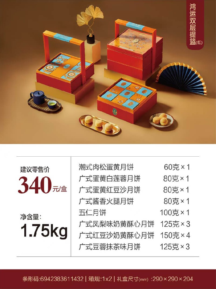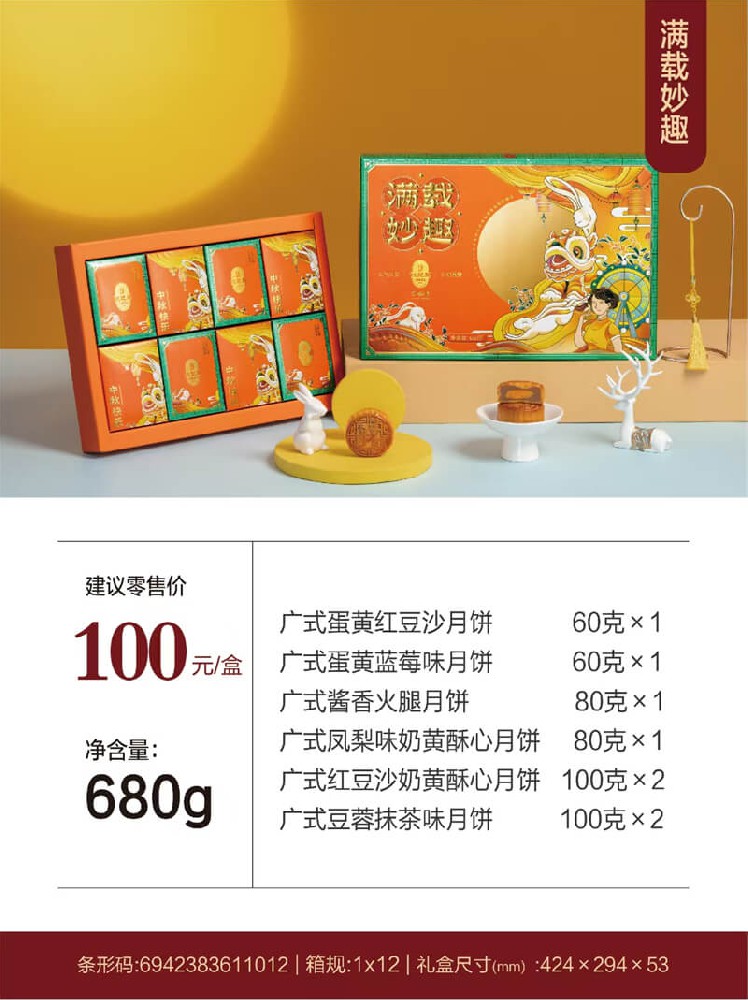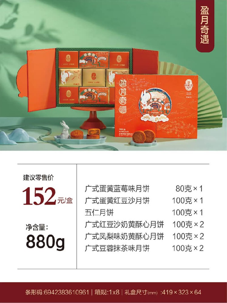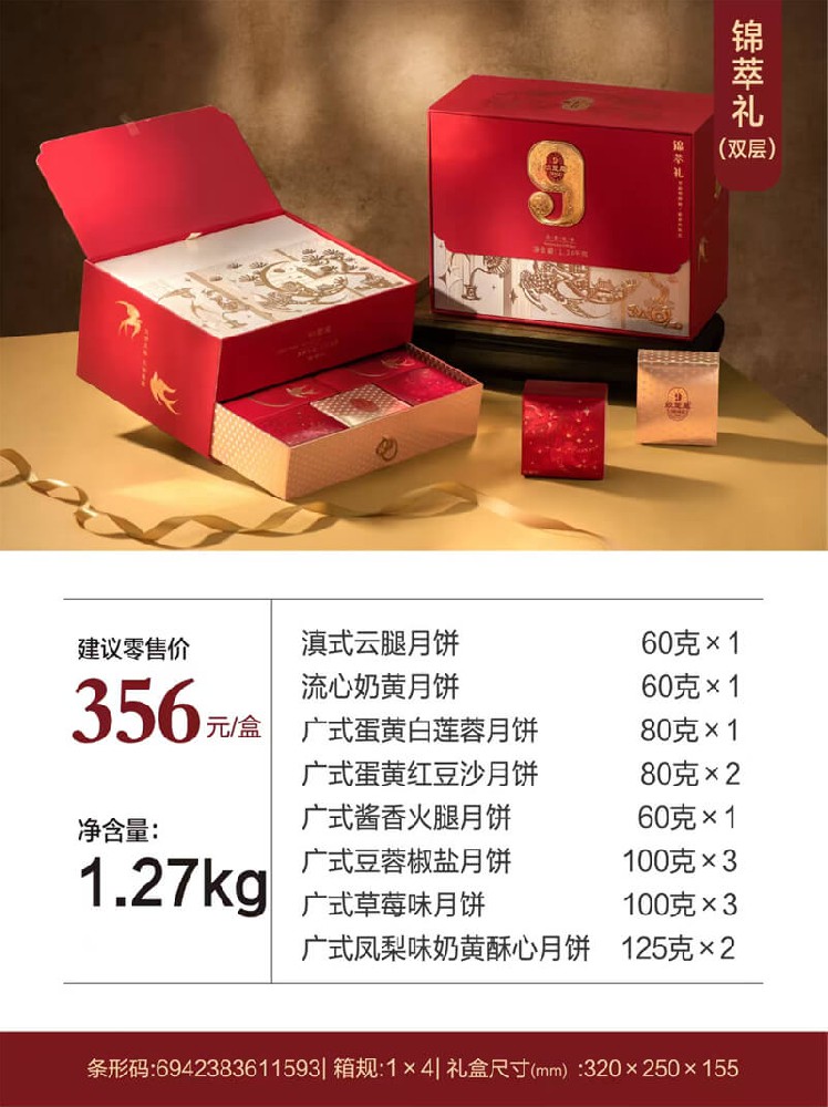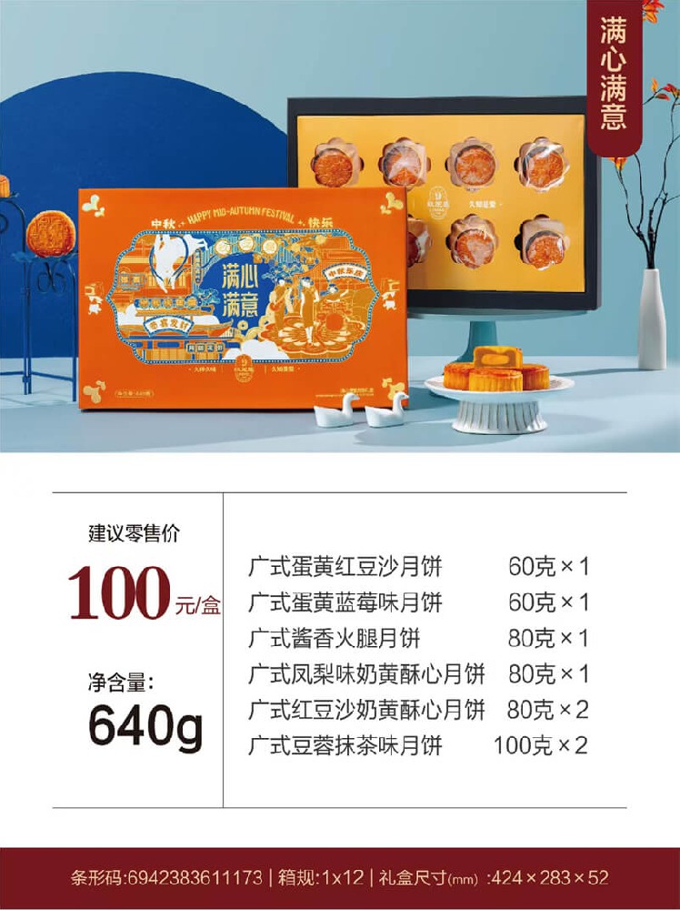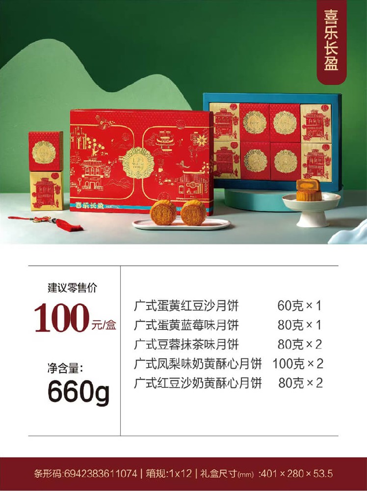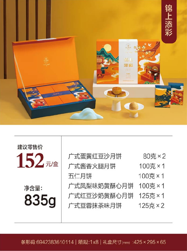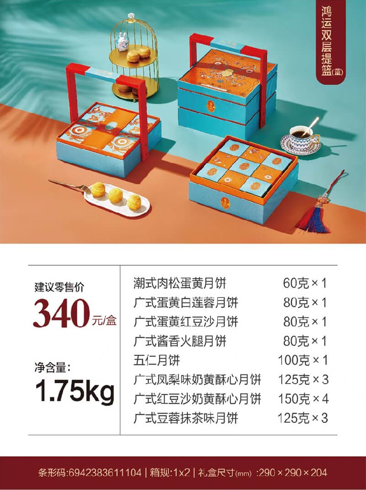 内容物:滇式云腿月饼60克×1潮式肉松蛋黄月饼60克×1黑松露流心奶黄月饼60克×1广式蛋黄白莲蓉月饼100克×1广式蛋黄红豆沙月饼150克×2广式豆蓉椒盐月饼150克×2广式红豆沙···...