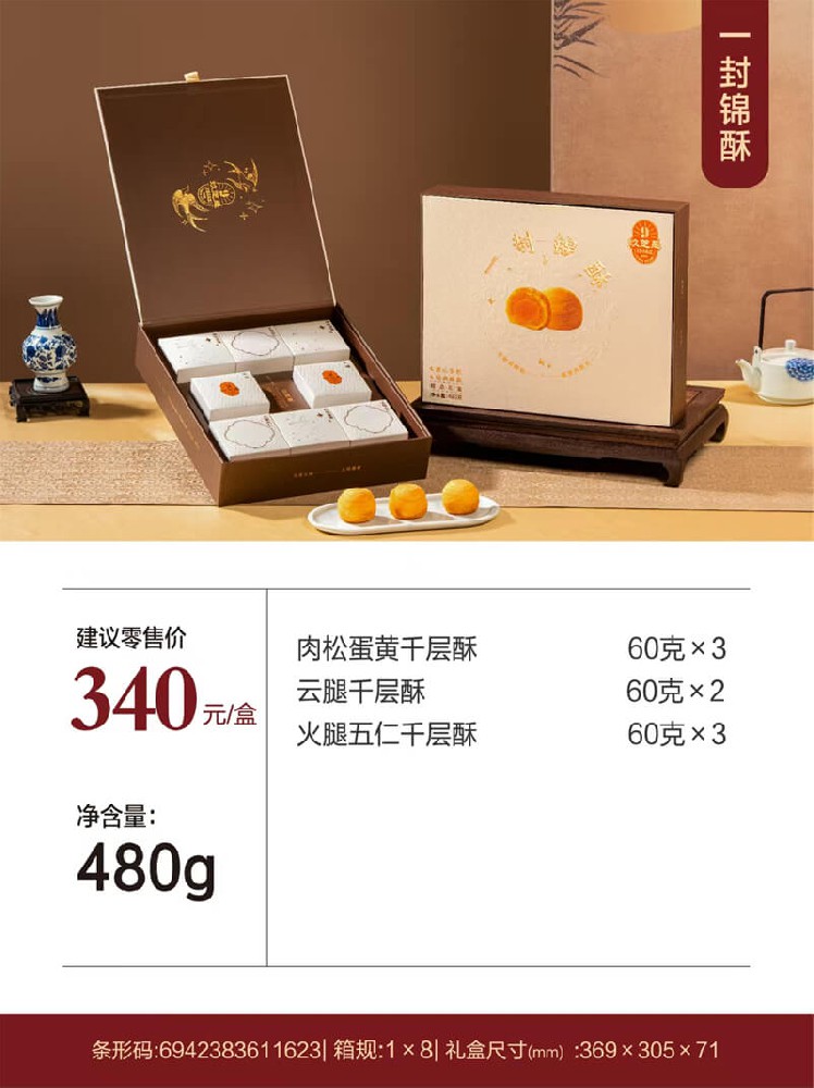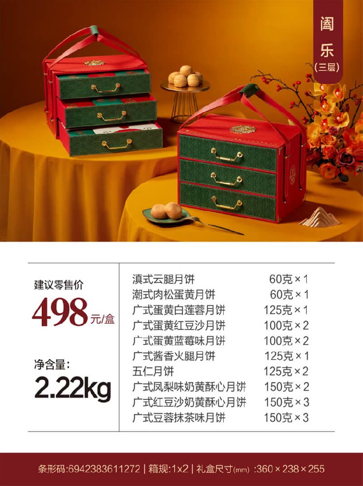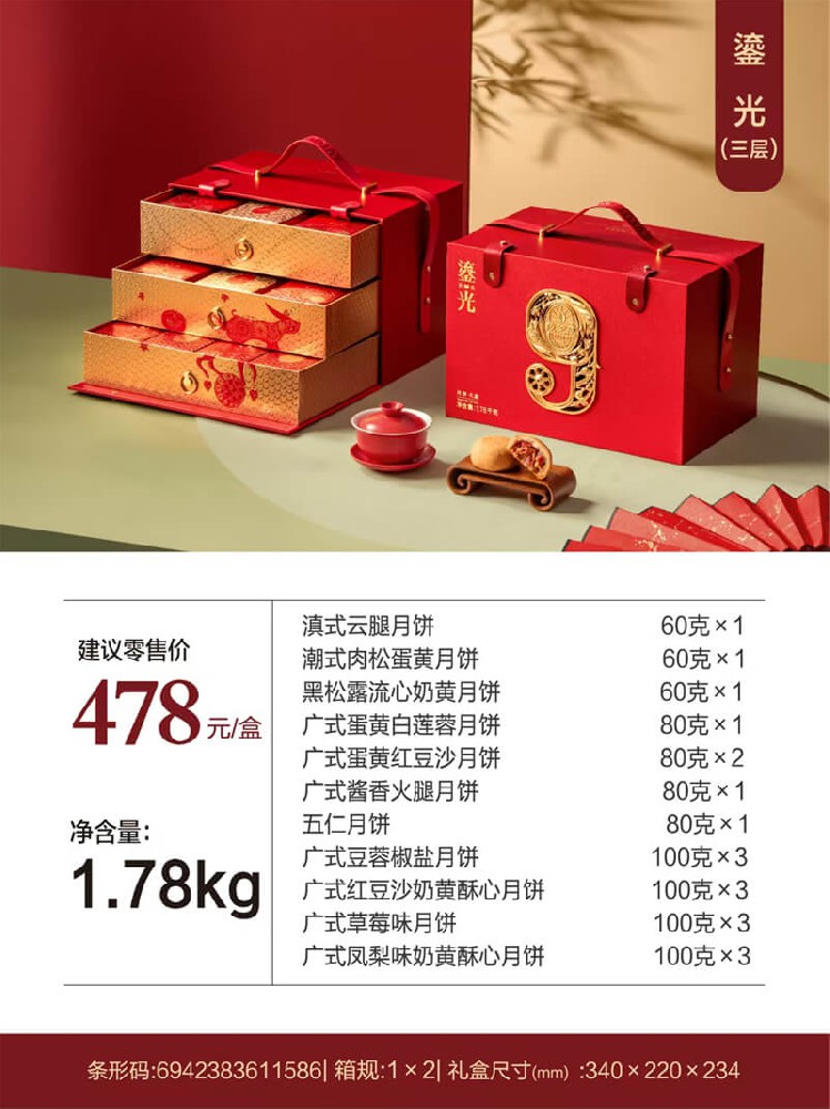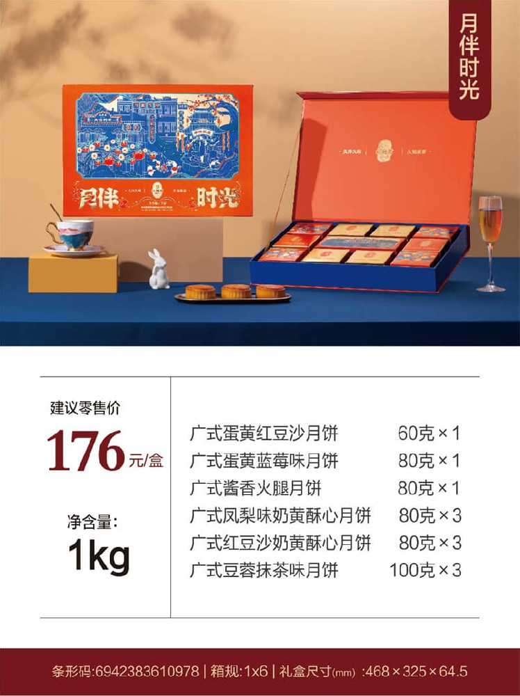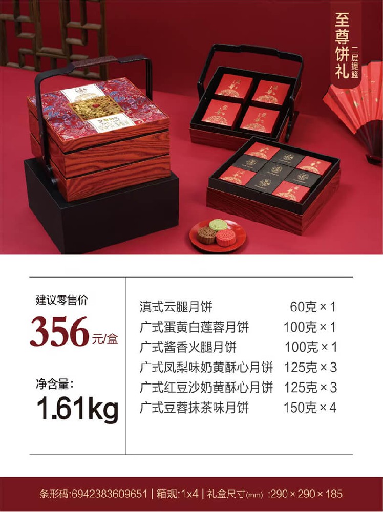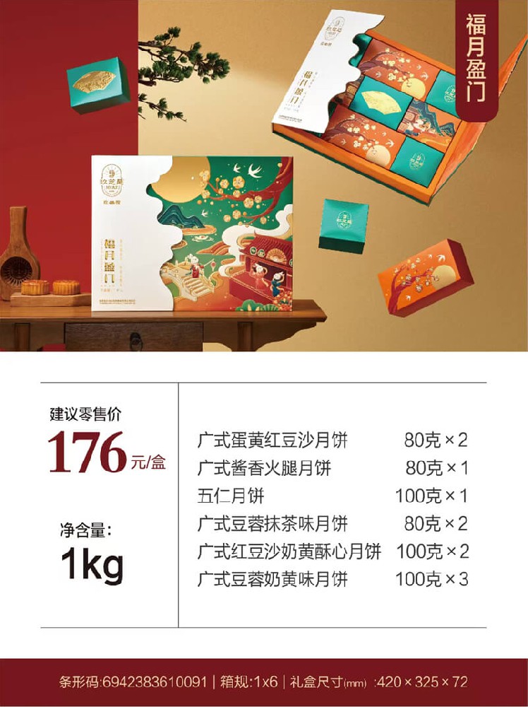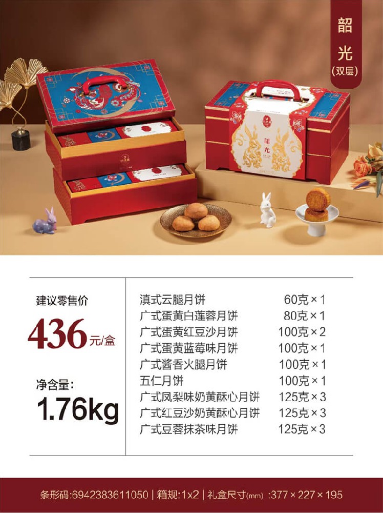内容物:滇式云腿月饼60克×1潮式肉松蛋黄月饼60克×1黑松露流心奶黄月饼60克×1广式蛋黄白莲蓉月饼100克×1广式蛋黄红豆沙月饼150克×2广式豆蓉椒盐月饼150克×2广式红豆沙···...